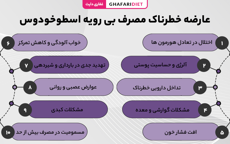 اسطوخودوس با وجود فواید فراوان، این گیاه همانند بسیاری از گیاهان دارویی، می تواند در برخی شرایط اثرات نامطلوبی داشته باشد. مصرف بی رویه، استفاده در افراد خاص (مانند کودکان، زنان باردار و بیماران خاص)، یا مصرف همزمان با برخی داروها، می تواند منجر به بروز عوارض جدی و گاهی خطرناک شود.