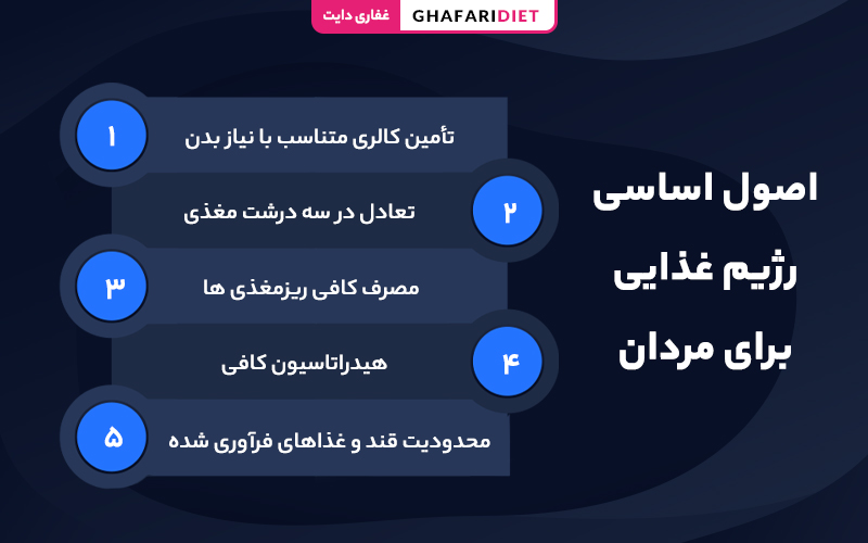 رعایت اصول زیر می تواند پایه و اساس یک رژیم سالم و پایدار برای آقایان باشد: