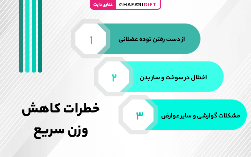 کاهش وزن سریع می تواند به سلامت شما آسیب بزند. این نوع کاهش وزن معمولاً موقتی است و ممکن است خطرات جدی به همراه داشته باشد: