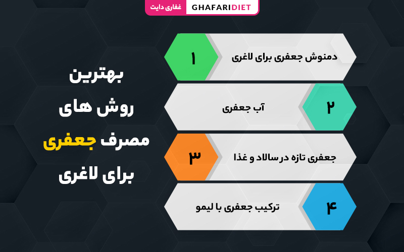 دمنوش جعفری یکی از رایج ترین روش های مصرف این سبزی برای کاهش وزن است. برای تهیه آن، می توان جعفری تازه یا خشک را در آب جوش دم کرد و روزانه یک تا دو فنجان نوشید. این دمنوش به دفع سموم، کاهش نفخ و افزایش متابولیسم کمک می کند.