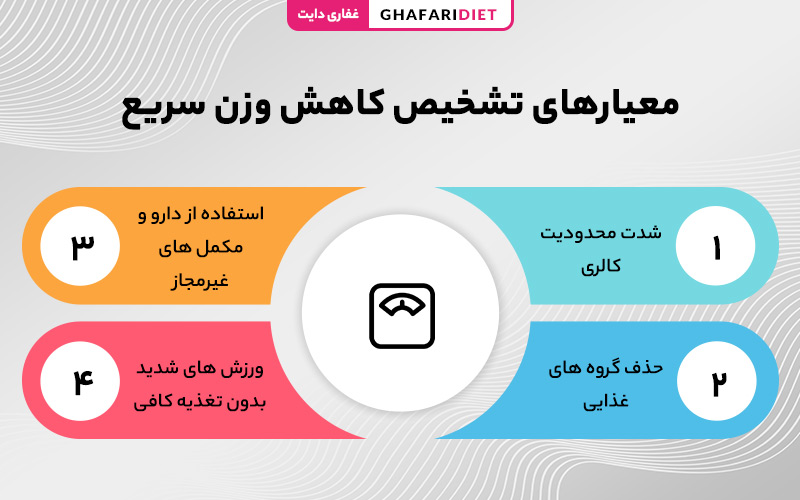 - شدت محدودیت کالری: رژیم های بسیار کم کالری (کمتر از ۸۰۰–۱۰۰۰ کالری در روز) یکی از نشانه های بارز لاغری سریع هستند.