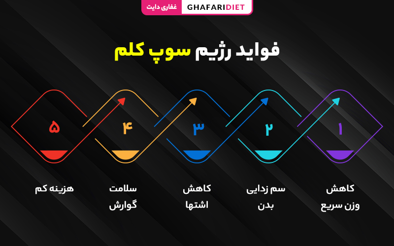 هسته اصلی این رژیم، یک سوپ گیاهی است که تقریباً هیچ چربی و کالری بالایی ندارد! کلم به عنوان ماده اصلی انتخاب شده زیرا سرشار از فیبر، آب و ترکیبات آنتی اکسیدانی است و می تواند احساس سیری طولانی تری ایجاد کند.