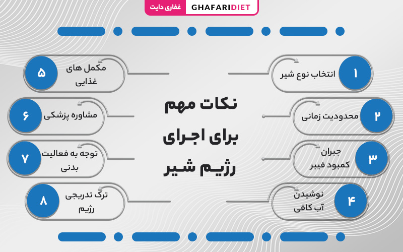 - محدودیت زمانی: رژیم شیر نباید بیش از ۷ تا ۱۰ روز ادامه یابد، زیرا خطر کمبود ویتامین ها و مواد معدنی وجود دارد.